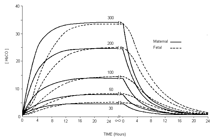 Teniendo en cuenta que no se puede disponer fácilmente de mediciones de la carboxihemoglobina en la población expuesta, se han elaborado modelos matemáticos para pronosticar las concentraciones de carboxihemoglobina a partir de exposiciones conocidas al monóxido de carbono en diversas circunstancias. El modelo mejor conocido para el pronóstico de la carboxihemoglobina sigue siendo la ecuación de Coburn, Forster y Kane. La solución lineal es útil para examinar los datos de contaminación del aire que producen niveles relativamente bajos de carboxihemoglobina, mientras que la solución no lineal ofrece una buena capacidad de pronóstico incluso para la exposición a concentraciones elevadas de monóxido de carbono. Los modelos de regresión podría ser útiles sólo cuando las condiciones de aplicación son muy próximas a las reinantes al calcular los parámetros.