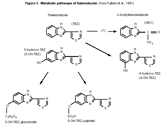 5-hydroxy tiabendazole. In plasma, both unchanged tiabendazole and