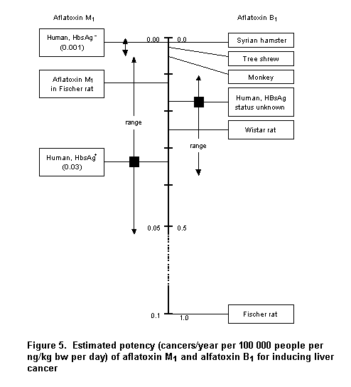 Aflatoxins were evaluated by the Committee at its thirty-first, forty-sixth, and forty-ninth meetings (Annex 1, references 77, 122, and 131). At its forty-ninth meeting, the Committee considered estimates of the carcinogenic potency of aflatoxins and the potential risks associated with their intake. At that meeting, the Committee reviewed a wide range of studies conducted in animals and humans that provided qualitative and quantitative information on the hepatocarcinogenicity of aflatoxins. The Committee evaluated the potency of these contaminants, linked those potencies to estimates of intake, and discussed the potential impact of hypothetical standards on sample populations and their overall risk. In its evaluation, the Committee stated that the carcinogenic potency of aflatoxin M1 in sensitive species is about one order of magnitude less than that of aflatoxin B1. In particular, the Committee noted that the carcinogenic potency of aflatoxin B1 is substantially higher in carriers of hepatitis B virus (about 0.3 cancers per year per 100 000 persons per ng/kg bw per day), as determined by the presence in serum of the hepatitis B virus surface antigen (HBsAg+ individuals), than in HBsAg– individuals (about 0.01 cancers per year per 100 000 persons per ng/ kg bw per day). Populations with both a high prevalence of HBsAg+ and a high aflatoxin intake might benefit from reductions in aflatoxin intake. The Committee also noted that vaccination against hepatitis B virus would reduce the number of carriers of the virus, and thus reduce the potency of the aflatoxins in vaccinated populations, leading to a reduction in the risk for liver cancer.
