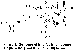 T-2 toxin is the trivial name for 4beta,15-diacetoxy-3alpha,dihydroxy-8alpha-[3-methylbutyryl-oxy]-12,13-epoxytrichothec-9-ene, which is shown in Figure 1. Corresponding to the molecular formula C24H34O9, its relative molecular mass is 466.5 g/mol. 15-Acetoxy-3alpha,4beta-dihydroxy-8alpha-[3-methylbutyryloxy]-12,13-epoxytrichothec-9-ene is the systematic name of HT-2 toxin. The molecular formula is C22H32O8, and the relative molecular mass is 424.5 g/mol. The structures of T-2 and HT-2 toxins differ only in the functional group at the C-4 position. As T-2 toxin is readily metabolized to HT-2 toxin, these two mycotoxins were evaluated together.