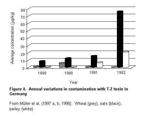 T-2 toxin was found at a concentration of 2 ng/ml in cows’ milk after administration of 160–180 mg/day for 4 days (equivalent to 0.42–0.48 mg/kg bw per day) (Yoshizawa et al., 1981).