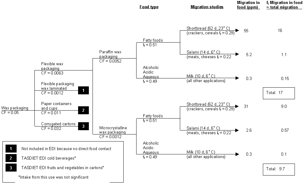 Reich, A,G., Douglass, J.S., van der Reit, B., Eickhoff, J.C. & Heimbach, J.T. (1998) Dietary exposure assessment for direct and indirect food use applications for mineral hydrocarbons. Prepared for the American Petroleum Institute by TAS-ENVIRON.