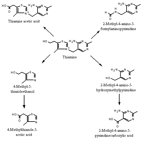 In a 90-day feeding study, groups of 15 FDRL strain rats of each sex were maintained on a diet which provided a daily intake of 5 g/kg bw of an imitation meat flavour containing thiamine hydrochloride (No. 1030) at a concentration of 13 mg/kg. Analysis of the meat flavour revealed that 40–50% of the thiamine hydrochloride had degraded to 4-methyl-5-thiazoleethanol (No. 1031). Thus, the daily intake of thiamine hydrochloride was 33–44 mg/kg bw, and the daily intake of 4-methyl-5-thiazoleethanol was 11–14 mg/kg bw. The animals were observed daily for behaviour, appearance and survival. Body weights and food intake were reported weekly. At 6 and 12 weeks, the following clinical parameters were measured: blood haemoglobin and haematocrit, total and differential leukocyte counts, blood glucose and urea nitrogen and urinary pH, albumin and glucose. All animals were necropsied at termination of the study. A range of tissues was examined microscopically.