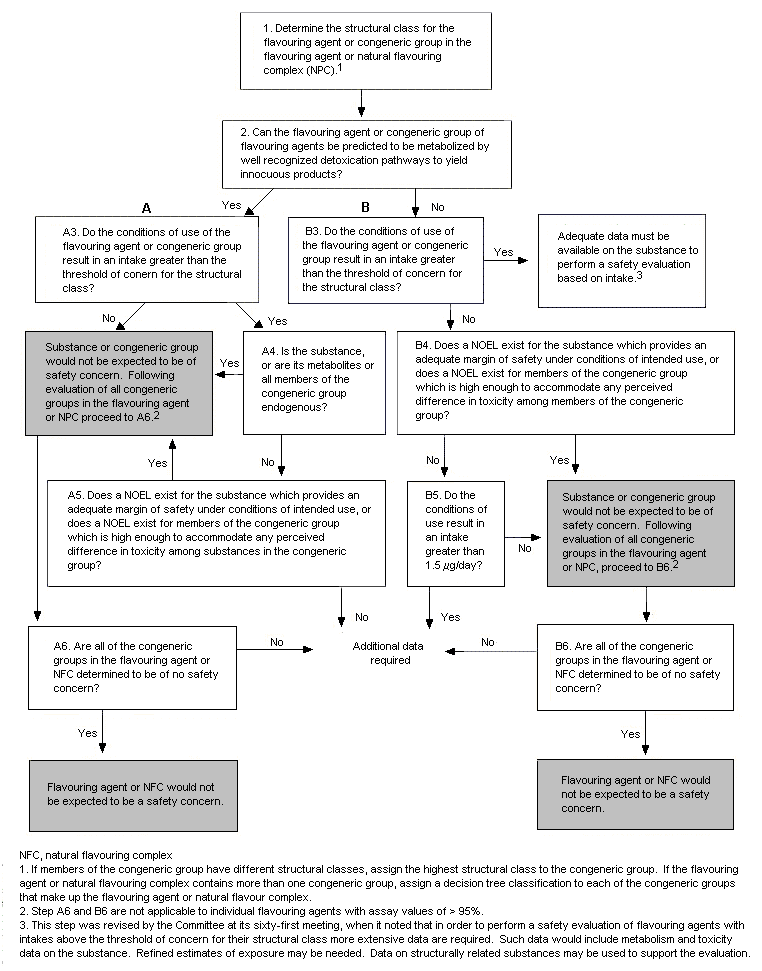 It is recommended that the current Procedure for the Safety Evaluation of Flavouring Agents be expanded to include the option to evaluate both individual flavouring agents and natural flavouring complexes. Like individual flavouring agents, flavouring agents present in a natural flavouring complex will be assigned to the appropriate congeneric groups. Subsequently, each congeneric group will be evaluated according to the current steps in the Procedure (see Figure 1). Once all congeneric groups contained within the natural flavouring complex have been evaluated, a conclusion can be made concerning the safety of the combination of congeneric groups that constitute the complex. This modification to the existing Procedure to allow the inclusion of assessments for congeneric groups will permit the evaluation of all types of flavouring agents, including relatively pure individual flavouring agents (chemical assay >95%), agents containing appreciable amounts of secondary components minimum chemical assay, <95%), and natural flavouring complexes containing different congeneric groups of individual flavouring agents. The proposed modification to the Procedure constitutes an efficient use of resources because it builds upon the evaluations previously conducted and relies on the extensive series of monographs on well-defined congeneric groups of flavouring agents already published by the Committee.