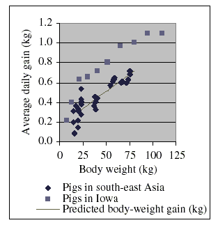 Intake of dry matter is related to body weight (for pigs) or average daily body-weight gain (for chickens). The choice of body weight (pigs) and average daily body-weight gain (chickens) was dictated by the nature of available empirical data. From the available empirical data, linear relationships were derived that were valid for a certain period of growth of the animals. |
