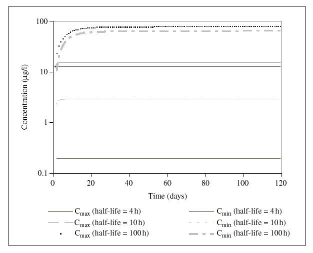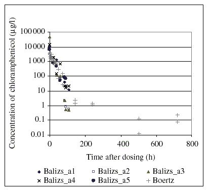 Using the selected model, it can be shown that the conditions described for pigs in Table 1, while producing an average steady-state concentration of chloramphenicol of 1 µg/kg, would at the same time cause a fluctuation at steady state of between approximately 0.06 µg/kg (minimum, shortly before the next dose) and 4.4 µg/kg (maximum, shortly after the last dose).