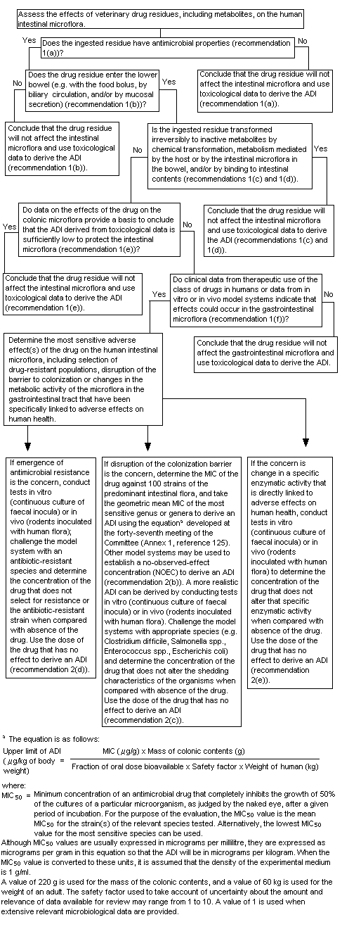 7. "If disruption of the colonization barrier is the concern, determine the MIC of the drug against 100 strains of predominant intestinal flora and take the geometric mean MIC of the most sensitive genus or genera to derive an ADI using the formula discussed at the forty-seventh meeting of the Committee (Annex 1, reference 125). Other model systems may be used to establish a no-observed-effect concentration to derive an ADI."