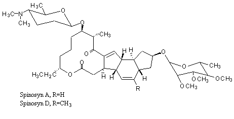 Spinosad is the ISO approved name for a mixture of compounds formed as a fermentation product of the soil organism Saccharopolyspora spinosa. The mixture comprises approximately 10 related chemicals, with proteinaceous, carbohydrate and inorganic salt compounds derived from the fermentation process. Two closely related compounds, spinosyn A and spinosyn D, in a ratio of approximately 6:1 or 7:1, represent about 88% of the composition of spinosad and are responsible for most of its insecticidal activity. Spinosyn A and spinosyn D differ only in respect to substitution of a hydrogen by a methyl group at a position that is not metabolically labile. The remainder of spinosad is made up of a number of closely related spinosyns, which differ in the location of other minor substitutions at various sites around the molecule (Figure 1).