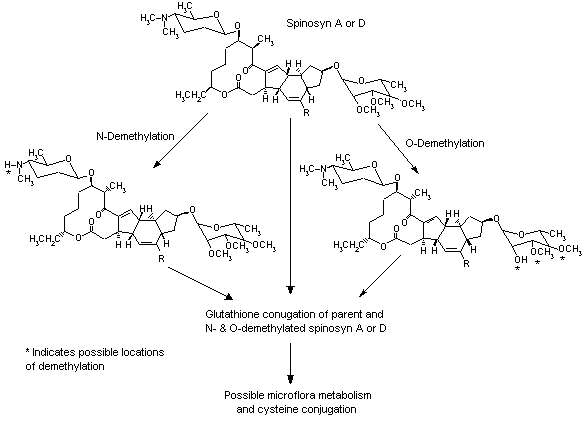 In the study of Domoradzki et al. (1995), described above, conjugation with glutathione, either directly or after O or N demethylation, was identified as the major path of metabolism. Glutathione and cysteine conjugates of spinosyn A and of O-demethylated spinosyn A were tentatively identified as metabolites in faeces, as well as unconjugated O-demethylated spinosyn A. The biliary and urinary metabolites were tentatively identified as glutathione conjugates of spinosyn A and of O-demethylated spinosyn A. The metabolites identified in liver were the glutathione conjugates of spinosyn A and of O-demethylated spinosyn A. Unconjugated O- and N-demethylated spinosyn A were identified in the liver, lung, kidney, thyroid and plasma.