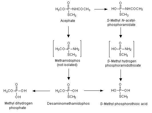 The pattern of excretion in urine did not differ quantitatively or qualitatively in males and females. Excretion was rapid, most of the radioactive material being recovered within 12 h. Urine contained 8295% of the administered dose, 14% was exhaled, and 1% was found in faeces. Less than 1% was found as residues in tissues and organs 72 h after the last administration. Liver and skin were the tissues with the highest proportions of residues (0.060.27% and 0.050.19%, respectively). The proposed metabolic pathway of acephate in rats is shown in Figure 2. Urinary metabolites were identified as unchanged acephate (7377%), O,S-dimethyl phosphorothioate (36%) and S-methyl acetylphosphoramidothioate (34%). No methamidophos was found (Lee, 1972).