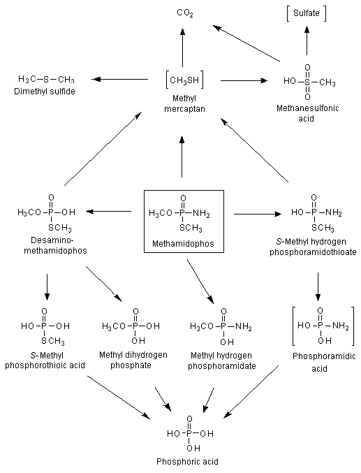 Methamidophos was administered to pregnant rats on day 18 of gestation, and the animals were killed 10 min and 0.5, 1, 3, 6, 12, 24 and 48 h after dosing. Urine, faeces, expired air, blood, selected tissues and fetuses were analysed. Methamidophos was the main compound present in urine, faeces and all tissues analysed. The degradation products detected were desamino-methamidophos, methyl dihydrogen phosphate, methyl hydrogen phosphoramidate, S-methyl hydrogen phosphoramidothioate and phosphoric acid. The metabolic degradation of methamidophos was proposed to involve desamination of methamidophos to desamino-methamidophos, followed by desmethylation to yield methyl dihydrogen phosphate and phosphoric acid. Methamidophos was also transformed to methyl hydrogen phosphoramidate, leading to phosphoric acid. Additionally, methamidophos was metabolized to S-methyl hydrogen phosphoramidothioate, which might be converted via phosphoramidic acid to phosphoric acid. Methamidophos, desamino-methamidophos and/or S-methyl hydrogen phosphoramidothioate were transformed to methyl mercaptan, which was converted in a final step to CO2.