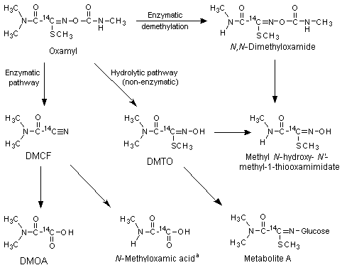 Studies of biotransformation in vitro and in vivo thus showed that oxamyl is metabolized in rats and mice via two major pathways, hydrolysis to the oxime (DMTO) and enzymatic conversion to DMOA (see Figure 1).
