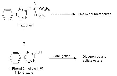 The metabolic fate of triazophos was examined in beagle dogs, with the same treatment and sampling regimen as for rats. Two female dogs were treated by gastric intubation with [14C]triazophos at a dose of 4.4–4.8 mg/kg bw in sesame oil. Urinary excretion predominated, representing an average of 85% of the administered dose after 24 h and 92% after 48 h. Faecal elimination accounted for 0.3% of the administered dose after 24 h and and 7.2% after 48 h. Maximal blood concentrations were attained after 2 h. After 48 h, no radioactivity was detectable in blood, and the mean half-life was 3.6 h. Residual concentrations in tissues were not determined because the animals were not killed at termination. Qualitatively, the metabolic fate of triazophos in dogs was similar to that in rats (see Figure 1). The urine contained the same three metabolites as in rats, namely 1-phenyl-3-hydroxy-(1H)-1,2,4-triazole (18% of the administered dose) and its glucuronide (60%) and sulfate (5%) conjugates. One metabolite was found only in dog urine (representing 11% of the administered dose), which was thought to be another sulfate ester conjugate of the 1-phenyl-3-hydroxy-(1H)-1,2,4-triazole metabolite. Quantitatively, less of this metabolite was present in dog urine (18% of the administered dose) at the time of analysis than in rats (43%). The instability of the glucuronide conjugate and its potential conversion to the free metabolite were also observed in dogs, and the somewhat higher concentration of the glucuronide metabolite in the urine of dogs (60% of the administered dose) than of rats (36%) was considered not to be significant. Unchanged triazophos was not detected in urine. The faeces contained low concentrations of triazophos and the free 1-phenyl-3-hydroxy-(1H)-1,2,4-triazole metabolite as well as five unidentified metabolites at about 0.7, 0.3 and 7.3% of the administered dose, respectively (Schwalbe-Fehl & Schmidt, 1986). GLP and QA statements were provided, and the protocol was consistent with guidelines.