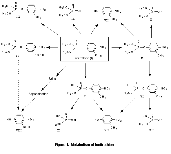 Fenitrothion is presumably rapidly absorbed from the mammalian intestinal tract, as evidenced by the appearance of radiolabel in blood from guinea-pigs and rats given [32P]fenitrothion orally. The presence of the oxygen analogue was demonstrated in all tissues examined (brain, heart, lung, liver, kidney, spleen, and muscle), and it was detectable in blood 1 min after intravenous injection of fenitrothion. This oxygen analogue (II in Figure 1) is the most important metabolite with respect to toxicity. It is formed in the microsomal fraction of the cell, the main organs responsible for the transformation being the liver and kidney. Fenitrooxon is further metabolized as indicated in Figure 1. The major excretion product found is 3-methyl-4-nitrophenol (VII) which can be oxidized further to 3-carboxyl-4-nitrophenol (VIII). Other metabolites are the demethyl derivatives (V and VI), which, with increasing dose, are excreted in increasing amounts. Nine metabolites have been isolated, most of which have also beeen identified. In vitro, formation of the oxygen analogue (II) depended on the availability of reduced nicotine adenine dinucleotide phosphate (NADPH2) and oxygen. Liver slices incubated with fenitrothion did not produce measurable amounts of fenitrooxon, while liver homogenates and the supernatant fraction of such homogenates appreciably activated added fenitrothion. No correlation between the toxicity and rate of formation of fenitrooxon could, however, be demonstrated (Miyamoto et al., 1963a; JMPR, 1969; Miyamoto, 1969). No observations were made in these studies on the distribution into fatty tissues, but studies of residues in milk, meat, and fat from cattle indicated the presence of approximately 0.001 mg/kg in these samples (JMPR, 1969; Miyamoto & Sato, 1969).