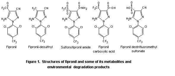 The following information was available on fipronil-desulfinyl for consideration by the present Meeting: metabolism in goats and hens, data on clinical signs of neurotoxicity (aggressivity, irritability) in control groups of mice and rats, and the results of a long-term study of toxicity and carcinogenicity in rats. Studies with the parent fipronil included a study of acute neurotoxicity in rats and a 6-week study of toxicity in mice treated orally. In addition, several studies were submitted on metabolites and photodegradation products, including the toxicity of single oral doses and induction of reverse mutation by sulfonofipronil amide, an environmental degradation product, and fipronil carboxylic acid, a metabolite and an environmental degradation product, and a 28-day study of toxicity with orally administered fipronil destrifluoromethyl sulfonate, an environmental degradation product. The structures of fipronil and the metabolites and environmental degradation products that were reviewed by the present Meeting are provided in Figure 1.
