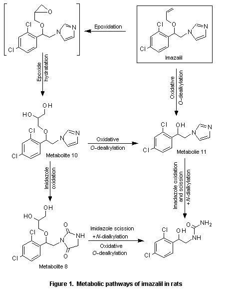 In the same study, little imazalil was excreted unchanged: less than 1% of the administered dose in the faeces and trace amounts in the urine. The compound was metabolized to at least 25 metabolites. Three major metabolites were identified, (±)-1-[2-(2,4-dichlorophenyl)-2-(2,3-dihydroxypropyloxy)ethyl]-imidaxolidine-2,5-dione (metabolite 8), (±)-1-[2-(2,4-dichlorophenyl)-2-(2,3-dihydroxypropyloxy)ethyl]-1H-imidazole (metabolite 10), and (±)-1-(2,4-dichlorophenyl)-2-imidazol-1-ylethanol (metabolite 11; see Figure 1). The main routes of metabolism were epoxidation, epoxide hydratation, oxidative O-dealkylation, oxidation, and scission and oxidative N-dealkylation. The metabolic pattern was similar after oral and intravenous administration and in animals of each sex (Mannens et al., 1993).
