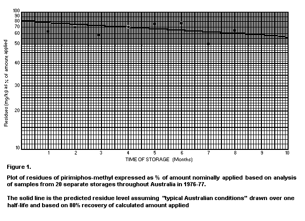 27°C. The rate of decline of pirimiphos-methyl residues is given in