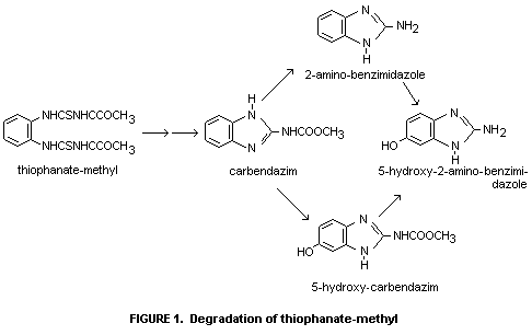 The metabolites carbendazim and 2-aminobenzimidazole appeared as free