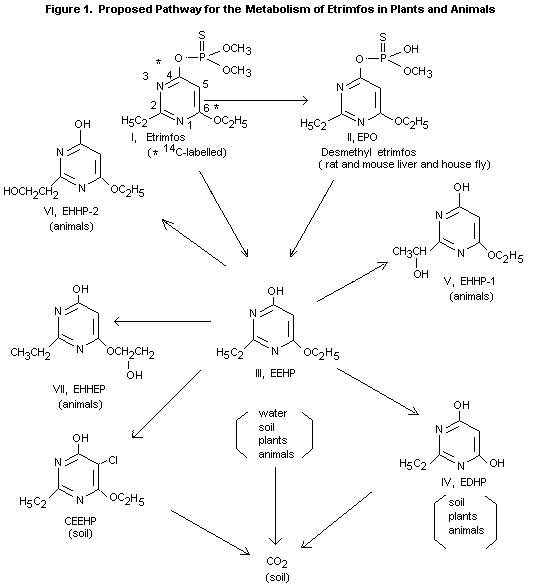 Etrimfos is rapidly degraded to water-soluble metabolites, mainly