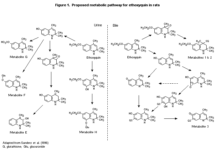 oral dose of ethoxyquin was excreted as metabolites within 48 h; after