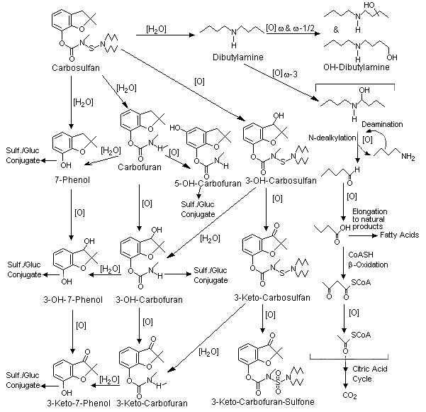 The metabolism of [14C]carbosulfan (purity, >97%) was studied in male and female Sprague-Dawley rats in vivo, in a study that complied with EPA guideline 85-1. Carbosulfan was labelled either in the phenyl moiety or in the dibutylamino moiety. Groups of five male and five female rats received unlabelled carbosulfan as a single oral dose at 4 (low) or 30 (high) mg/kg bw, or as repeated oral doses at 4 mg/kg bw per day for 14 days, followed by [14C]carbosulfan as a single oral dose at 4 mg/kg bw by gavage on day 15. Control rats received vehicle only (corn oil). Urine, cage rinses and faeces were collected at 0-4, 4-8, 8-12, 12-24, 24-36 h intervals and every 24 h thereafter for 168 h. At 168 h after dosing, the rats were killed, blood was sampled and bone (femur), brain, fat, kidneys, liver, lungs, muscle (thighs), ovaries, testes, heart, spleen, skin (shaven, dorsal), uterus and remaining carcass were collected. For rats treated with carbosulfan labelled in the dibutylamino side-chain, expired CO2 was collected. Urine, faeces and exhaled air were analysed for radio-label by liquid scintillation counting (LSC). Metabolites were identified by thin-layer chromatography (TLC) and high-performance liquid chromatography (HPLC). Identity of the major metabolites was confirmed by gas chromatography-mass spectrometry (GC-MS). Statements of compliance with GLP and QA were provided.