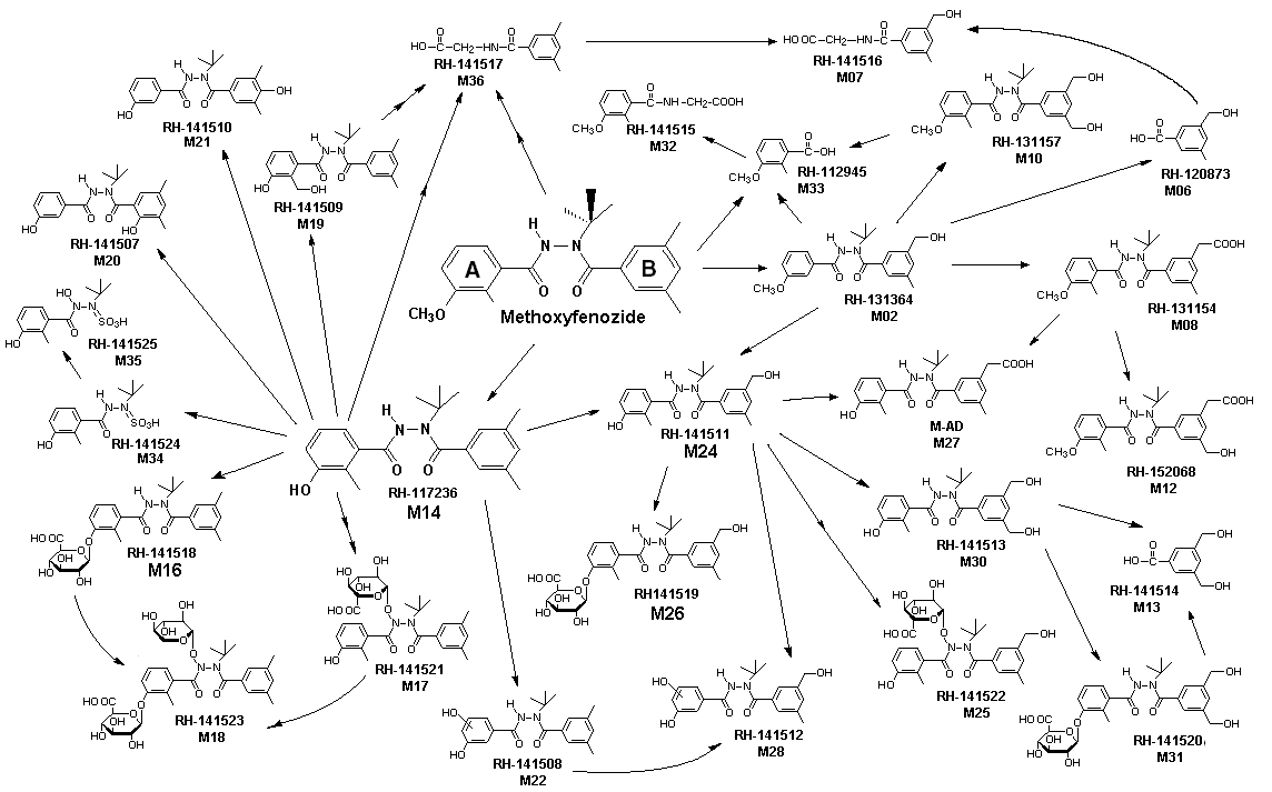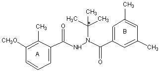 The toxicokinetics and metabolism of methoxyfenozide in rats were investigated using the following 14C-labelled test materials: (i) [methoxyphenyl ring uniform label-14C]methoxyfenozide ("A-ring label"), radiochemical purity, 98.2%; (ii) S[dimethylphenyl ring uniform label-14C]methoxyfenozide ("B-ring label"), radiochemical purity, 99.0%; (iii) t-butyl [14C]methoxyfenozide ("t label"), radiochemical purity, 96.4%.