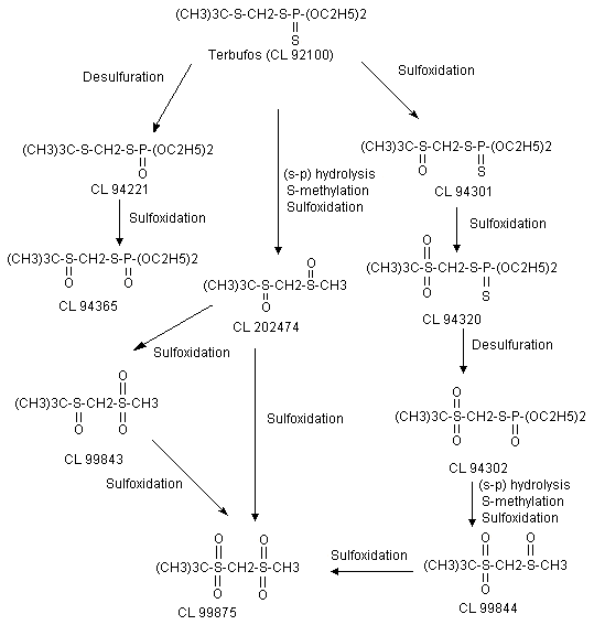 For all dosing regimens and for both sexes, about 70–90% of the urinary residue of radiolabel was reported to have been characterized for the 12–24 h period. Of this, about 67–80% of the residue was described as non-phosphorus-containing metabolites, about 1–4% as phosphorus-containing metabolites and about 2–9% as unknown substances (two substances). Of the non-phosphorus-containing metabolites, the major metabolite was CL 202 474; lesser amounts of CL 99 843, CL 99 844 and CL 99 875 were found. The only phosphorus-containing metabolite detected was CL 94 365; no parent compound was found. During the 12–24 h interval, for all dosing regimens and for both sexes, about 49–80% of the faecal residue of radiolabel was reported to have been characterized. Of this, about 17–34% was described as non-phosphorus-containing metabolites, about 8–44% as phosphorus-containing metabolites, and about 7–22% as unknown substances (five substances). The non-phosphorus-containing metabolites were CL 202 474, CL 99 843 and/or CL 99 844, and CL 99 875. The major phosphorus-containing entity was the parent compound (CL 92 100) with lesser amounts of CL 94 301 and CL 94 365. The proposed metabolic pathway for terbufos in rats, on the basis of the metabolites found in excreta, is depicted in Figure 1. Sulfoxidation and desulfuration of terbufos is followed by hydrolysis of the thiolophosphorus bond (S–P), enzymatic S-methylation and then additional S-oxidation.